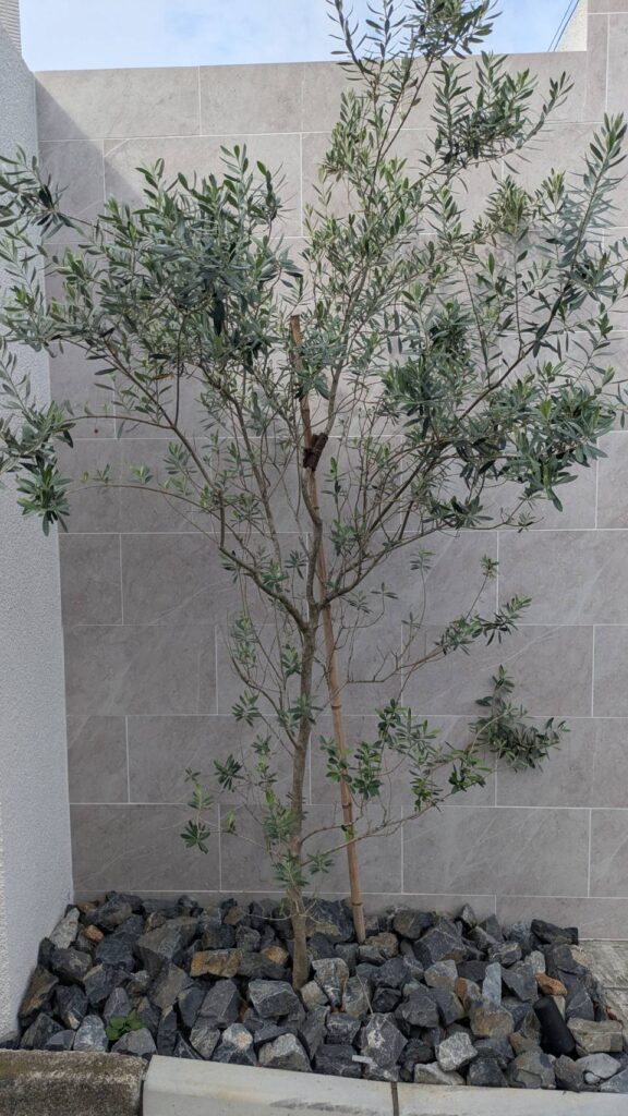 シンボルツリーはオリーブ グランドカバーには揖斐黒石に照明も取り付けてあります