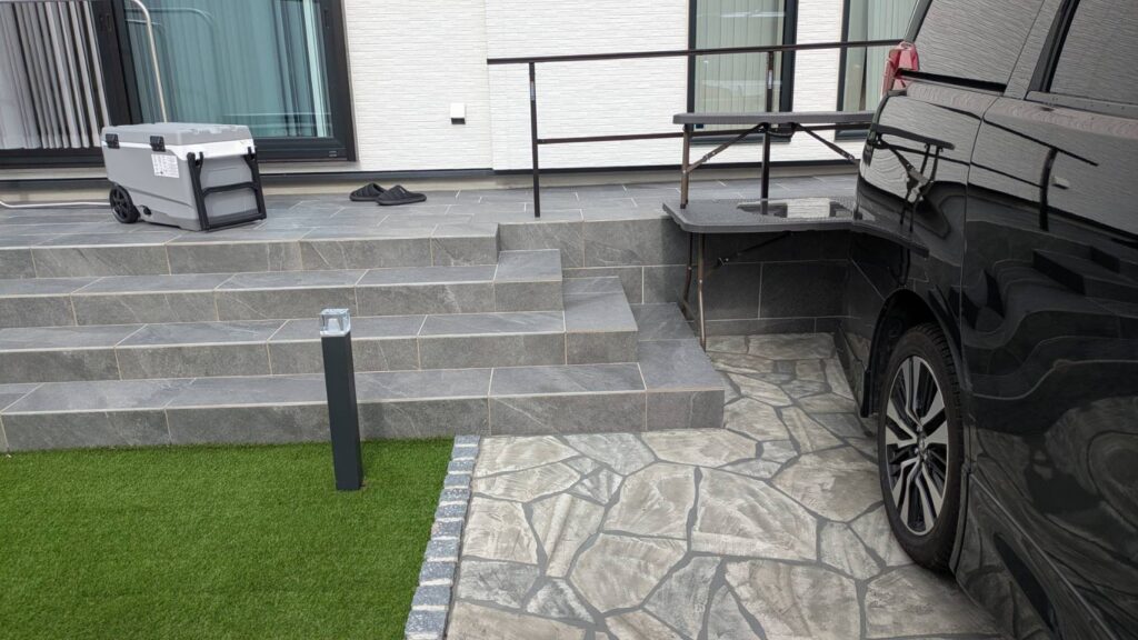 テラスにはオリジナルタイル『ノルディックストーン』とオリジナル人工芝『ZERO TURF』に暑さ対策の充填剤を敷き詰めてあります