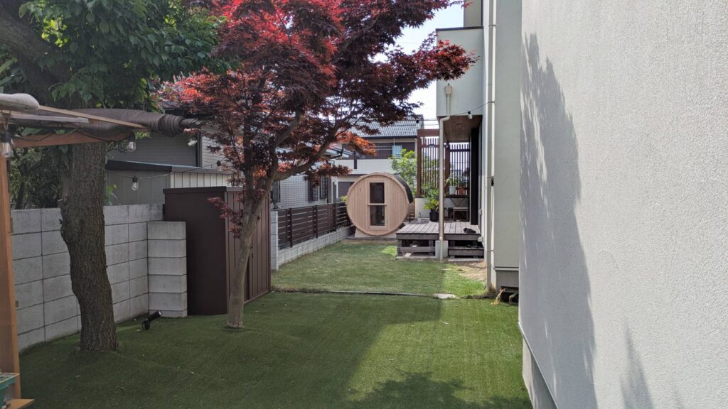 以前、サウナを設置させて頂きました現場となります、サウナ手前が芝生になっており、今年の暑さでギブアップ