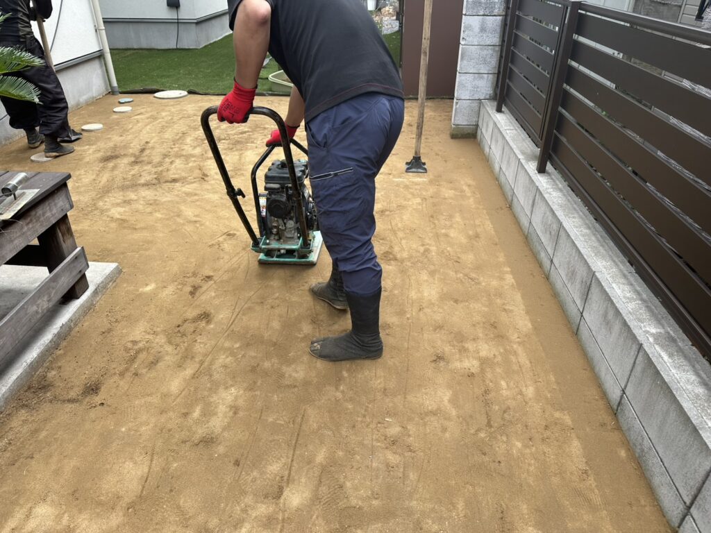 まづは芝生を剥がし余計な土を搬出し、新しく山砂にて不陸調整中