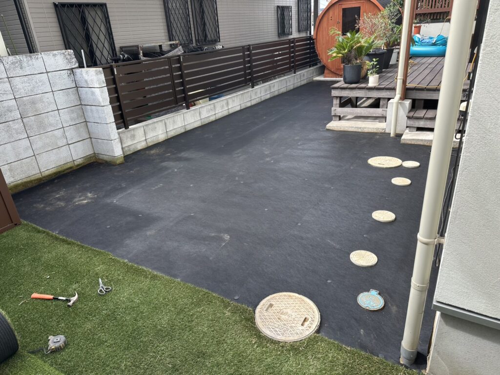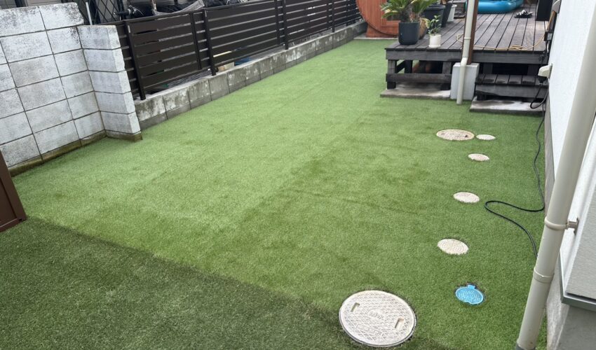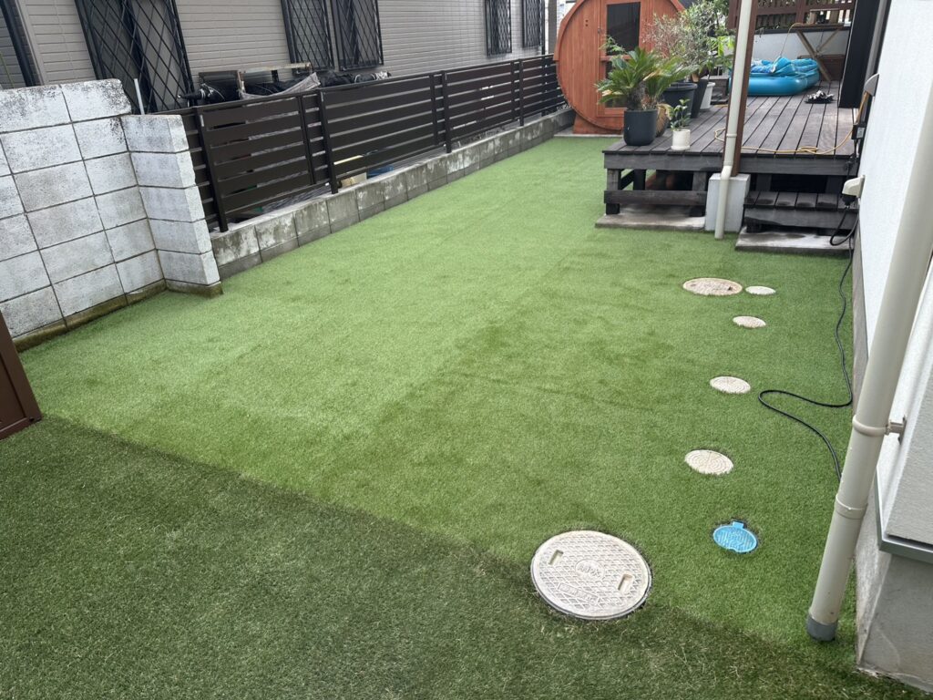 最後にオリジナル人工芝『ZERO TURF』を敷き詰めれば完成!メンテナンスが楽になりましたよ~