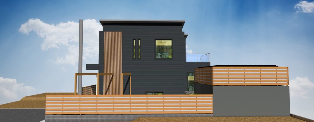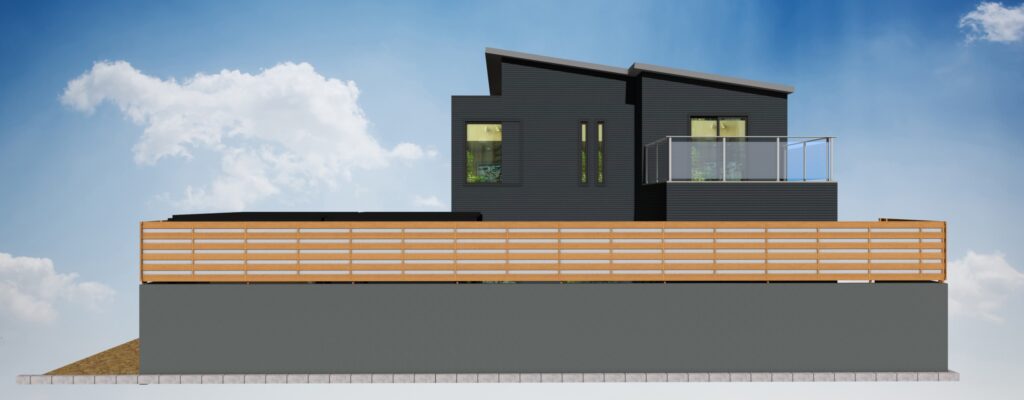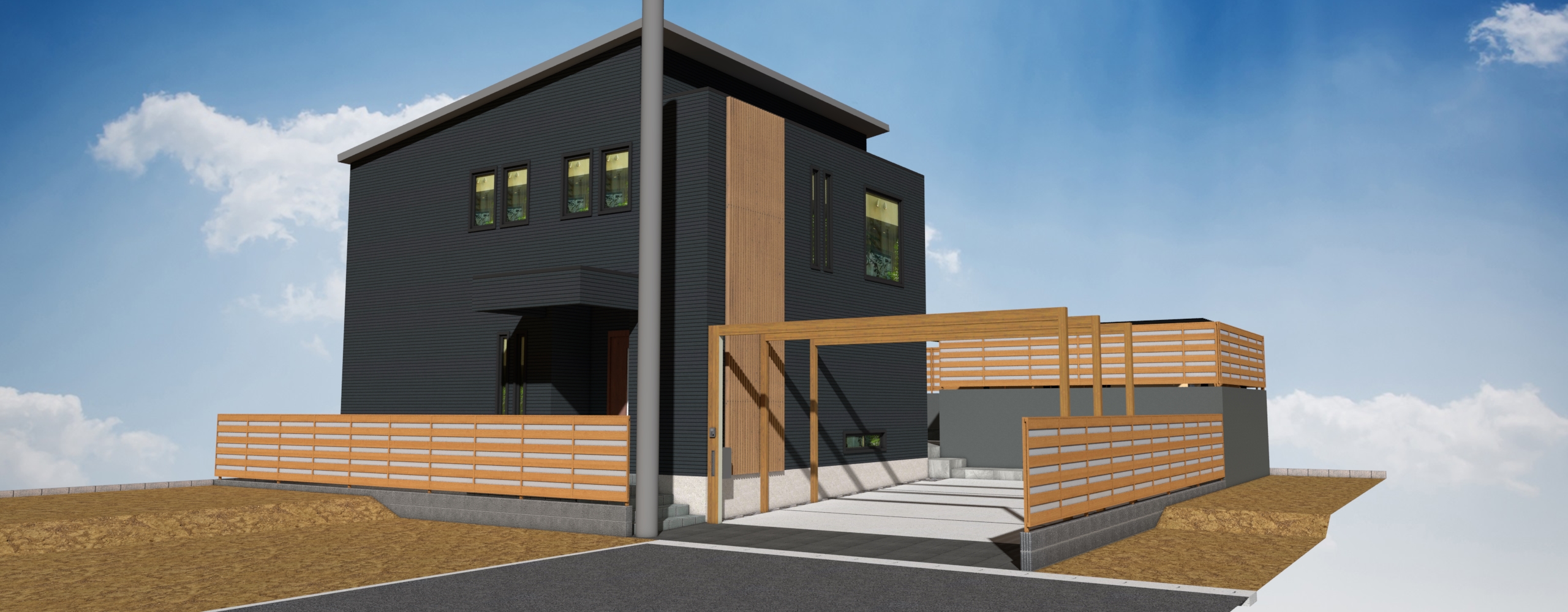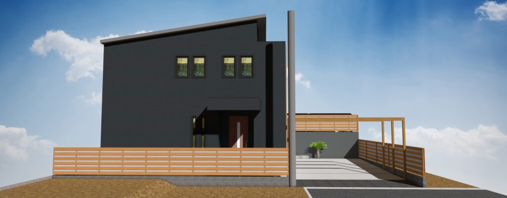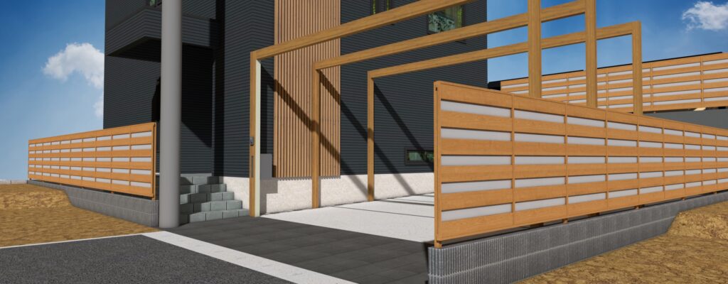 建物に合わせ木目調で全体的に合わせたエクステリアとなります