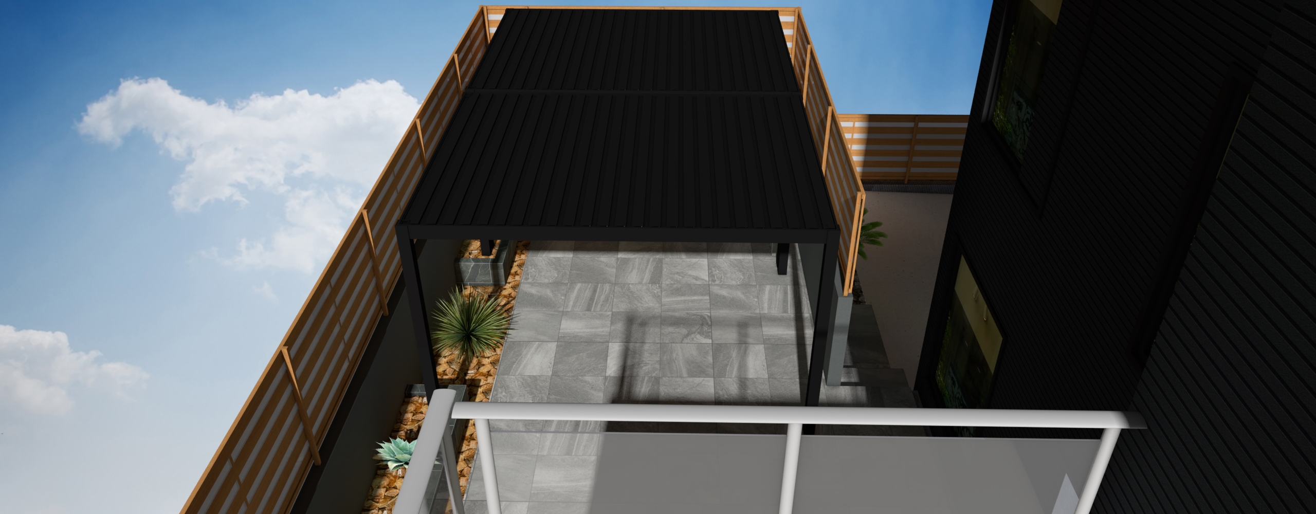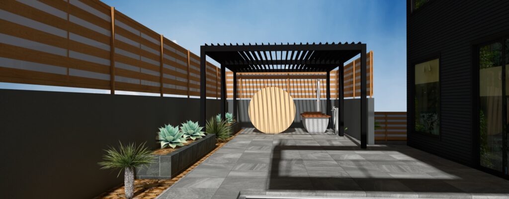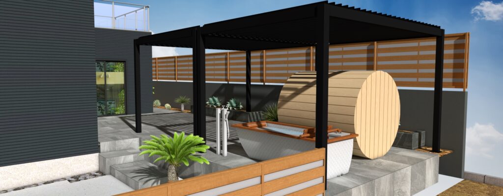 リビングからフラットにテラスに出られ、奥にはバレルサウナとホットバスを設置し、雨の日でも屋根を閉めれば快適に寛げる空間となります