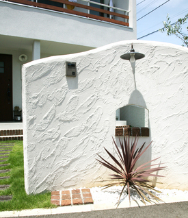 五角形の敷地を積極的に活かし、壁面に直角を用いず柔らかい曲線を多用した、解放感あふれるエクステリアです。 3面を壁で囲っている場合、ともすれば敷地内からは閉塞感や圧迫感を、敷地の外からは威圧感を与えかねません。 そこで、壁と壁の上部を曲線で仕上げ窓を設けることにより、解放感や風通しの良さを感じていただける外壁に仕上げてあります。 塗り壁に開けられた窓には煉瓦が嵌め込まれて、優しげでナチュラルな印象。 その窓からは緑がのぞき、さらにナチュラルなイメージを見るものに喚起します。施工関連情報