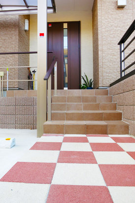 アプローチとカースペースの前の部分には、グレーと赤茶のインターロッキングで市松模様を描いています。