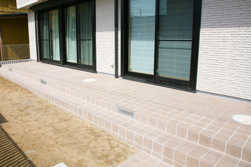 カースペースは2台分で、テラスと同系色のタイルを敷いて、アプローチ部分をコーディネイトしました。