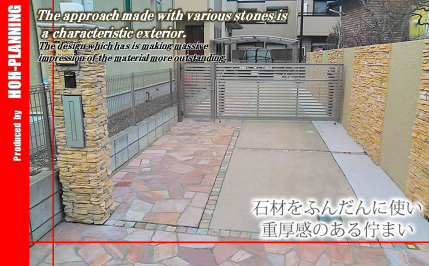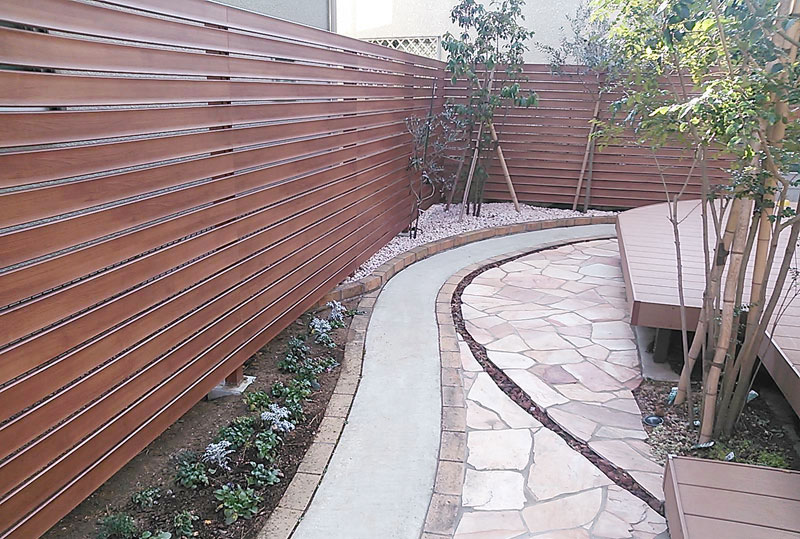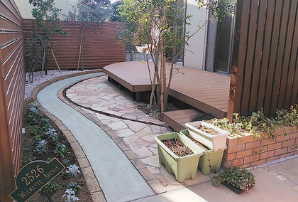アプローチ部分が広いI様邸、門まわりは吹き付け塗装と割石積調の塀で重厚な高級感のある作りにしました。 門柱にも塀と同じ石材を使用し統一感を出しつつ、アプローチには優しい色合いの乱貼りでメリハリをつけております。 お庭の方は、ウッドデッキやスリットフェンス、Dスクリーンと木材調の素材でまとめてナチュラルテイストなお庭に。 木肌をリアルに再現している製品で、耐候性に優れていますし、腐食・シロアリに強いのがメリット。 お手入れが簡単なのも魅力です。 フェンスを高めに設置していますので、お隣さんからの視線も遮られ、ウッドデッキでプライベートな時間を過ごせそうですね。 植栽スペースも多めに設けており、オリーブ・常緑ヤマボウシ・シマトネリコを植えて、花壇には可愛らしいお花でお庭を明るく華やかに彩っています。