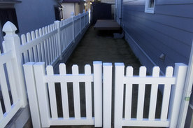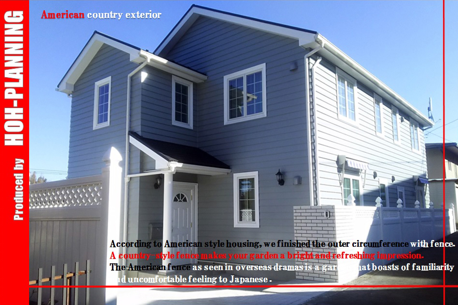 アメリカンスタイルな住宅に合わせて、外周をバイナルフェンスで仕上げました。