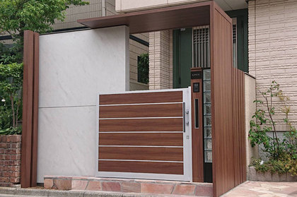 Gルーフのポイントルーフタイプとウォールスクリーンを組み合せて、門周りを格式の高い印象に仕上げました。