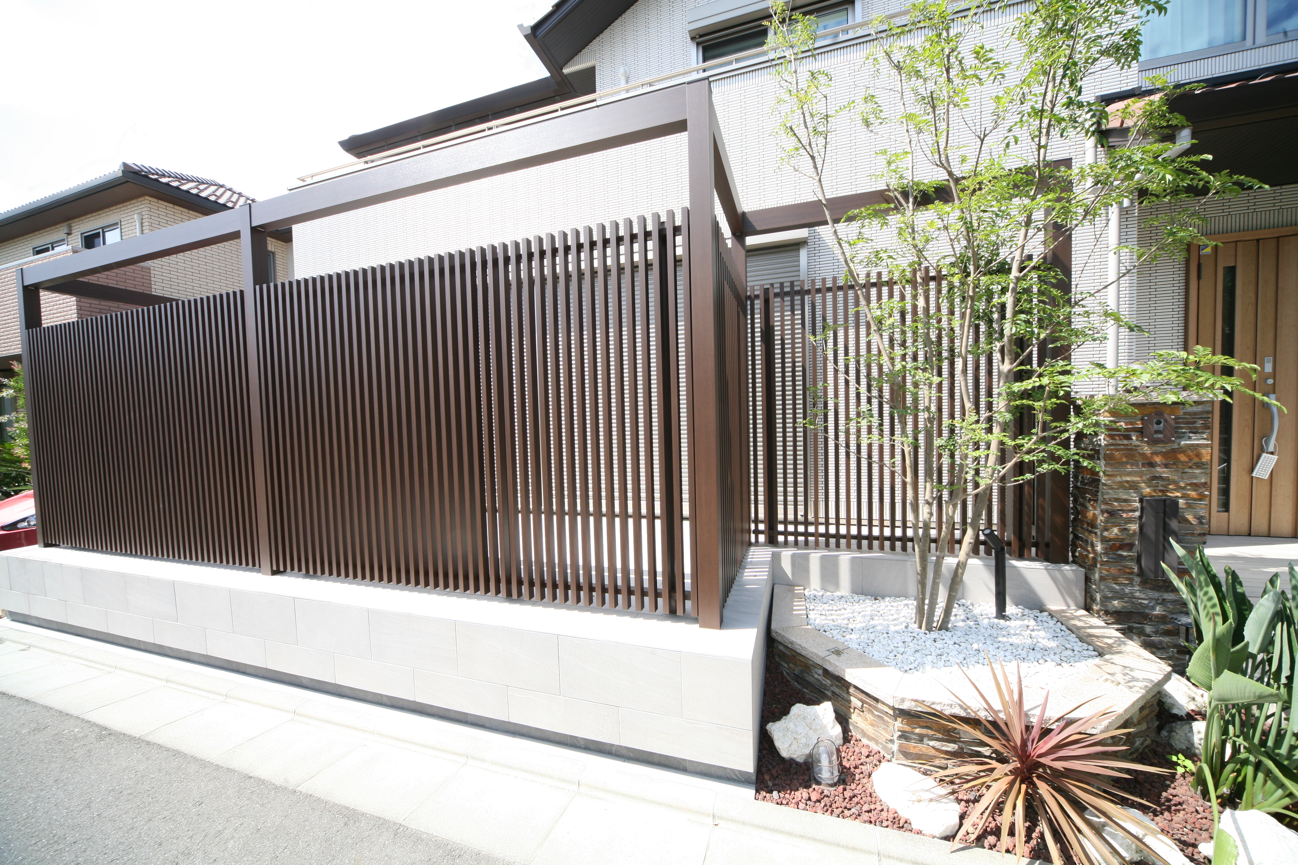 以前のお庭は植栽がメインとなっており、室内から外が見えてしまうお庭でした、目線を隠す事とお庭で寛げる様にとの事から設計させて頂きました。タイルテラスはエクアライブオリジナル『ノルディックストーン 300×600』YKKap リレーリアにてフレームを作成しルシアスフェンスにてカスタムしてみました、夜には照明を取り付けてありますので、タイルデッキが浮いているように輝き、周りの植栽ともとてもあっております。