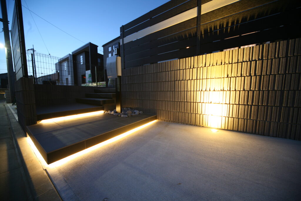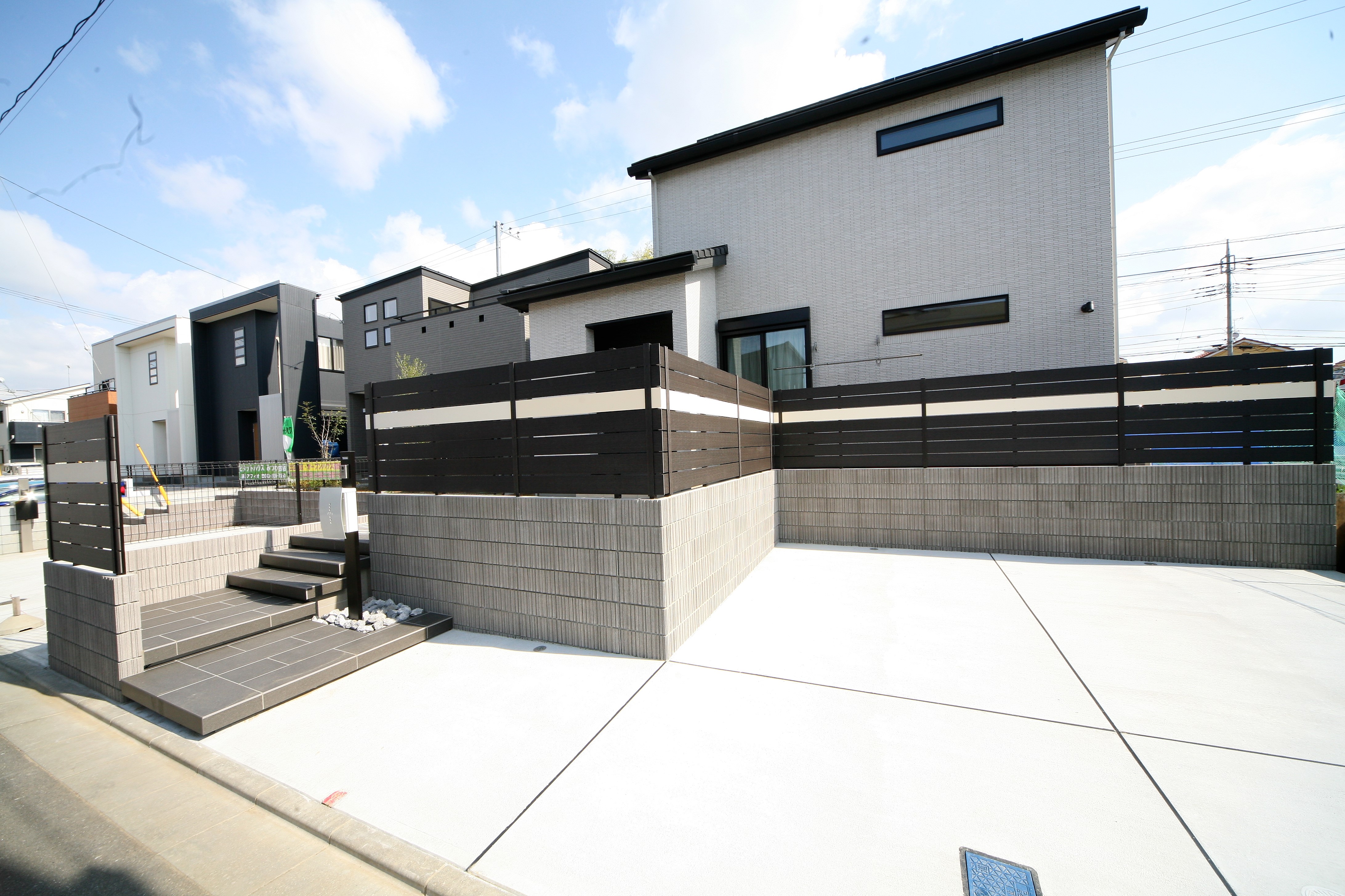 駐車スペースは2台と駐輪スペースが必要、また、リビングからの目線も気になるとの事、一番拘りたいのが階段の造りとの御希望から提案させて頂きました。建物のカラーに合わせ使ったカラーは主にブラック&ホワイト、機能門柱はオリジナルポストを取付けさせて頂き、他とは違う一品が出来上がりました、フェンスはブラック一色ですととの事から反対色のホワイトのボーダーラインを提案させて頂き、とても建物に合ったモダンなエクステリアが完成されました