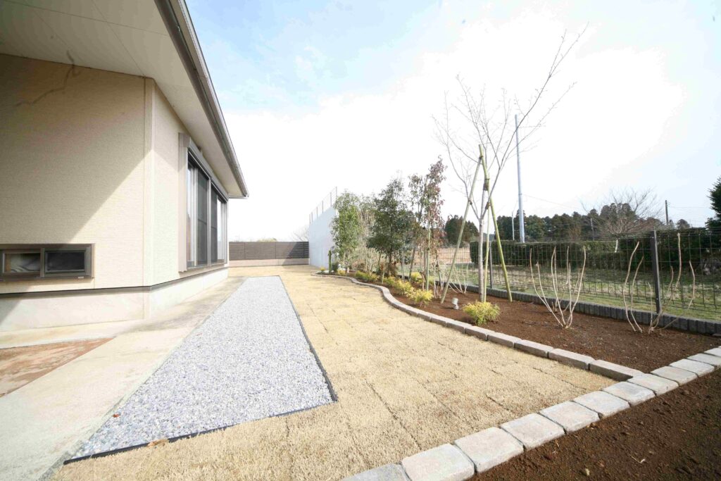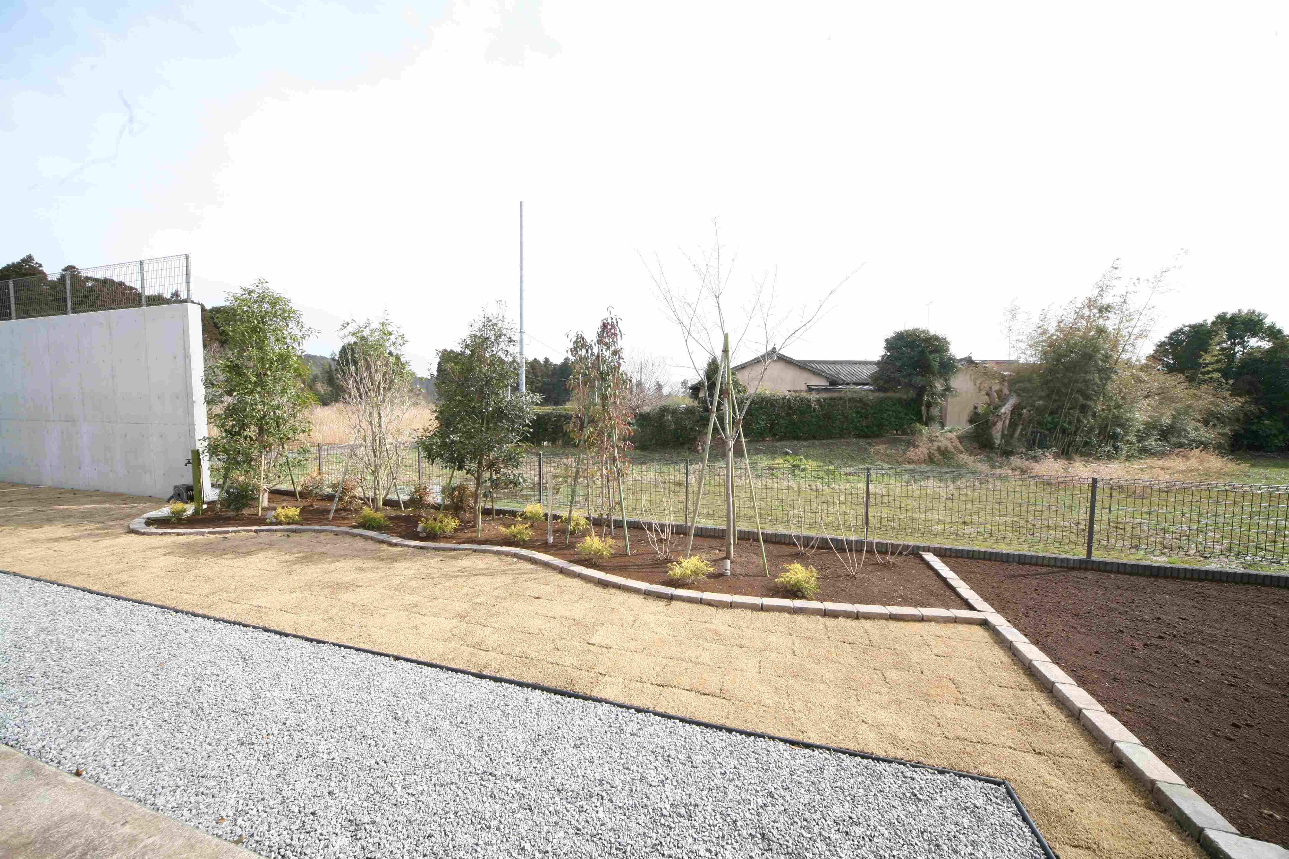 広大な御庭が新築時に土のままで残してあり、雑草等の管理が大変との事でプランニングさせて頂きました、趣味のテニスを御庭で練習できるようにとコート半面を作成し御庭で練習が出来るように出来ました、夜は照明もあり連取可能なスペースが出来上がりました、建物リビングより目線が気になるとの事もあり、季節を感じれるようにとの事で植栽を植えさせて頂きました、今まで行わなかった家庭菜園もスペースを作り今年より菜園の始まりになります、これだけあれば収穫も楽しくなるサイズ感で完成しました