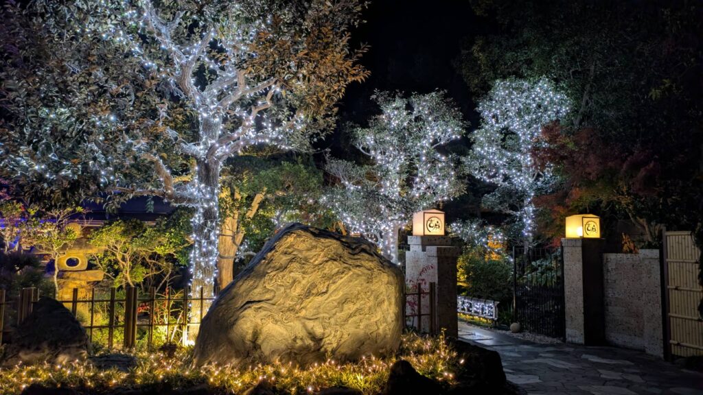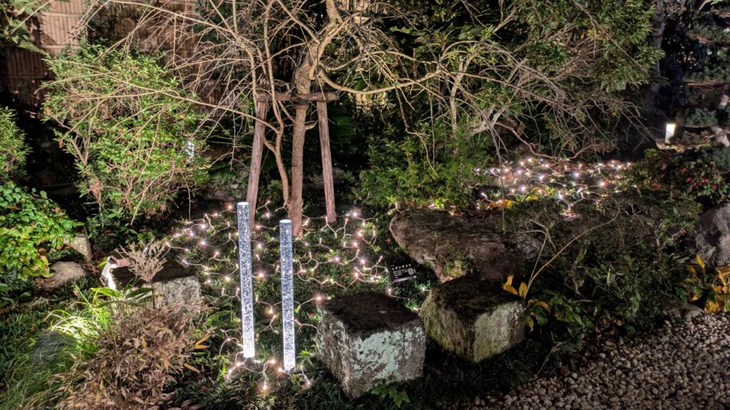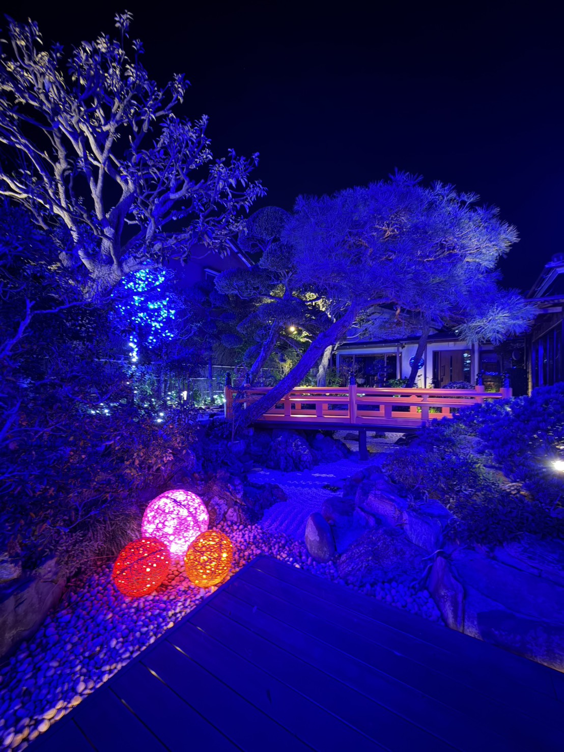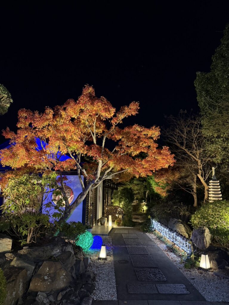 紅葉をライトアップにチェンジしオーガニックボールとアイスライトでお出迎え