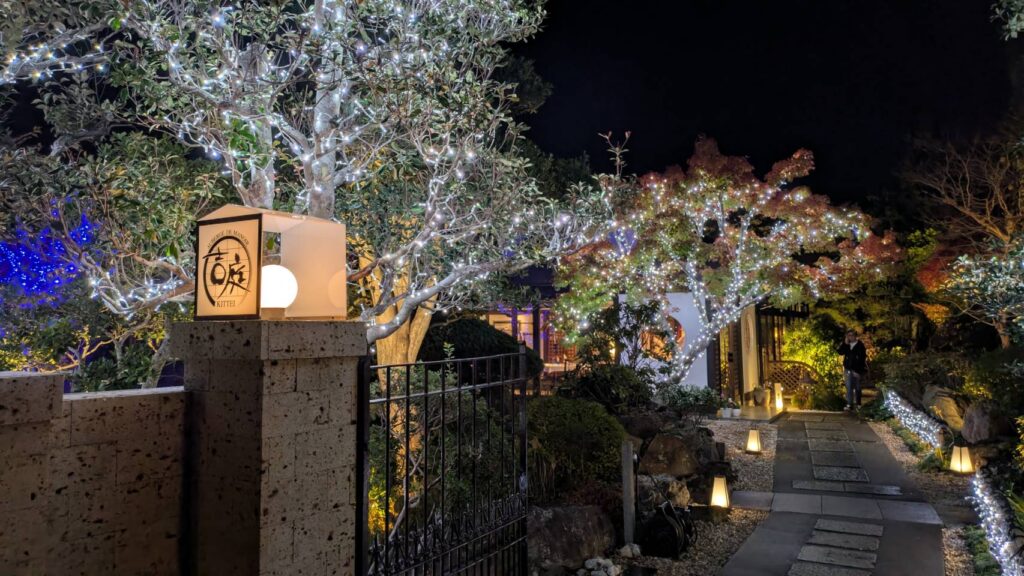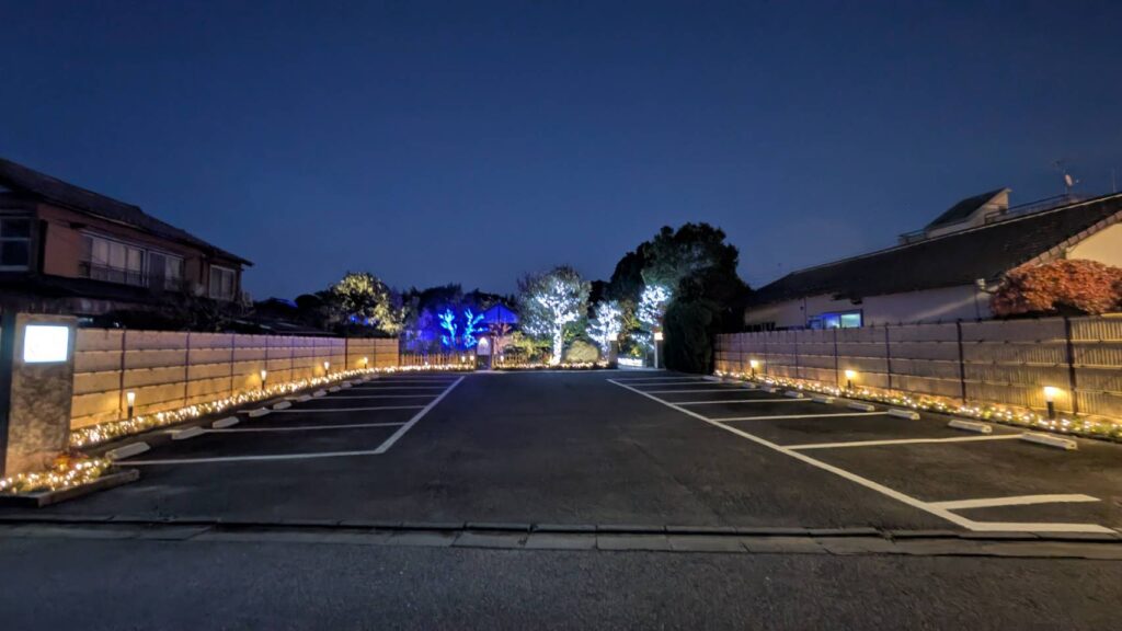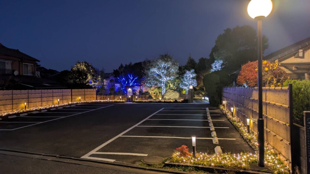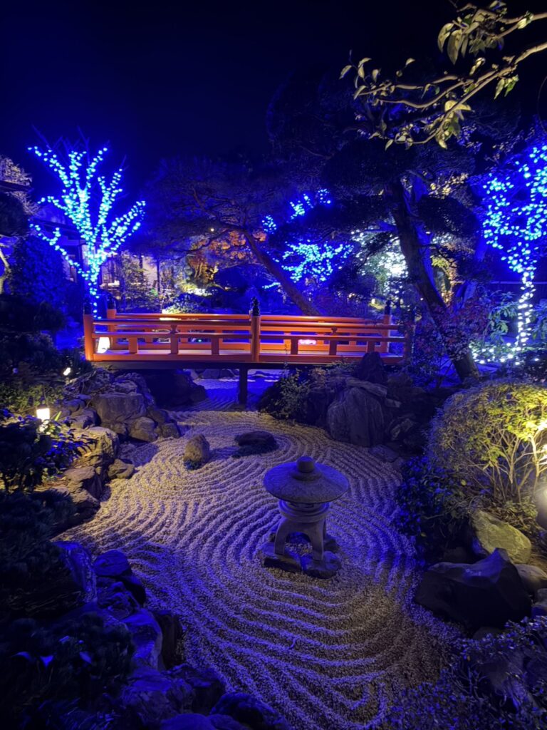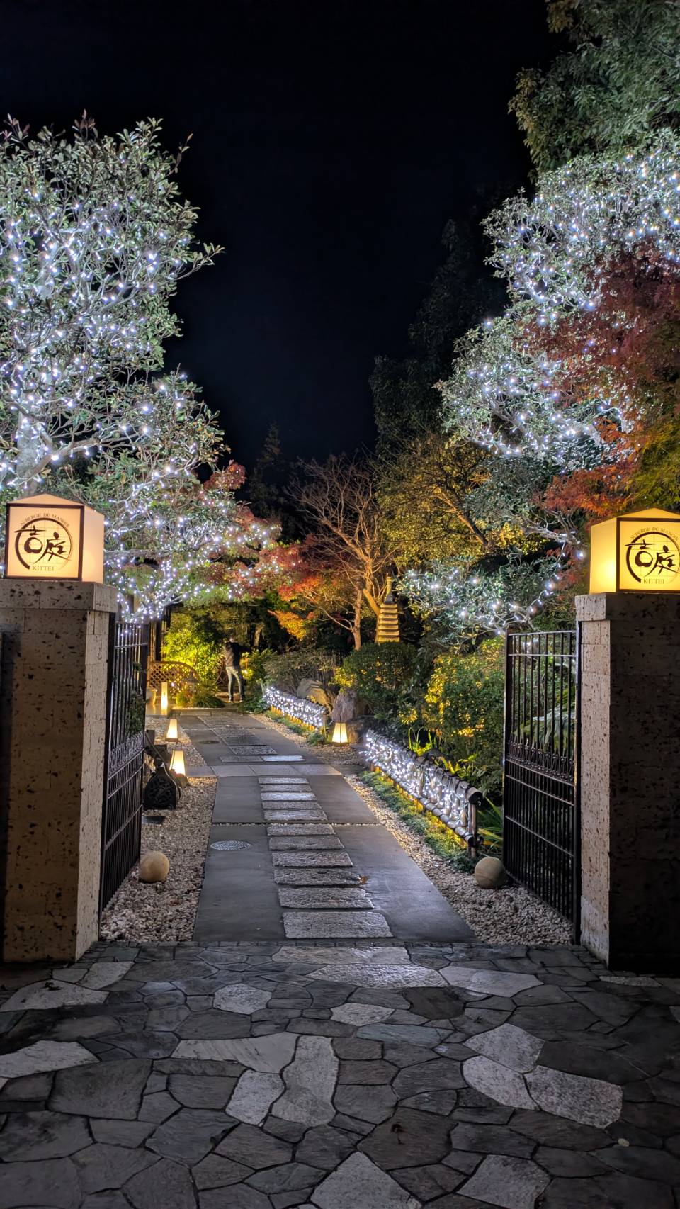 紅葉をライトアップにチェンジしオーガニックボールとアイスライトでお出迎え