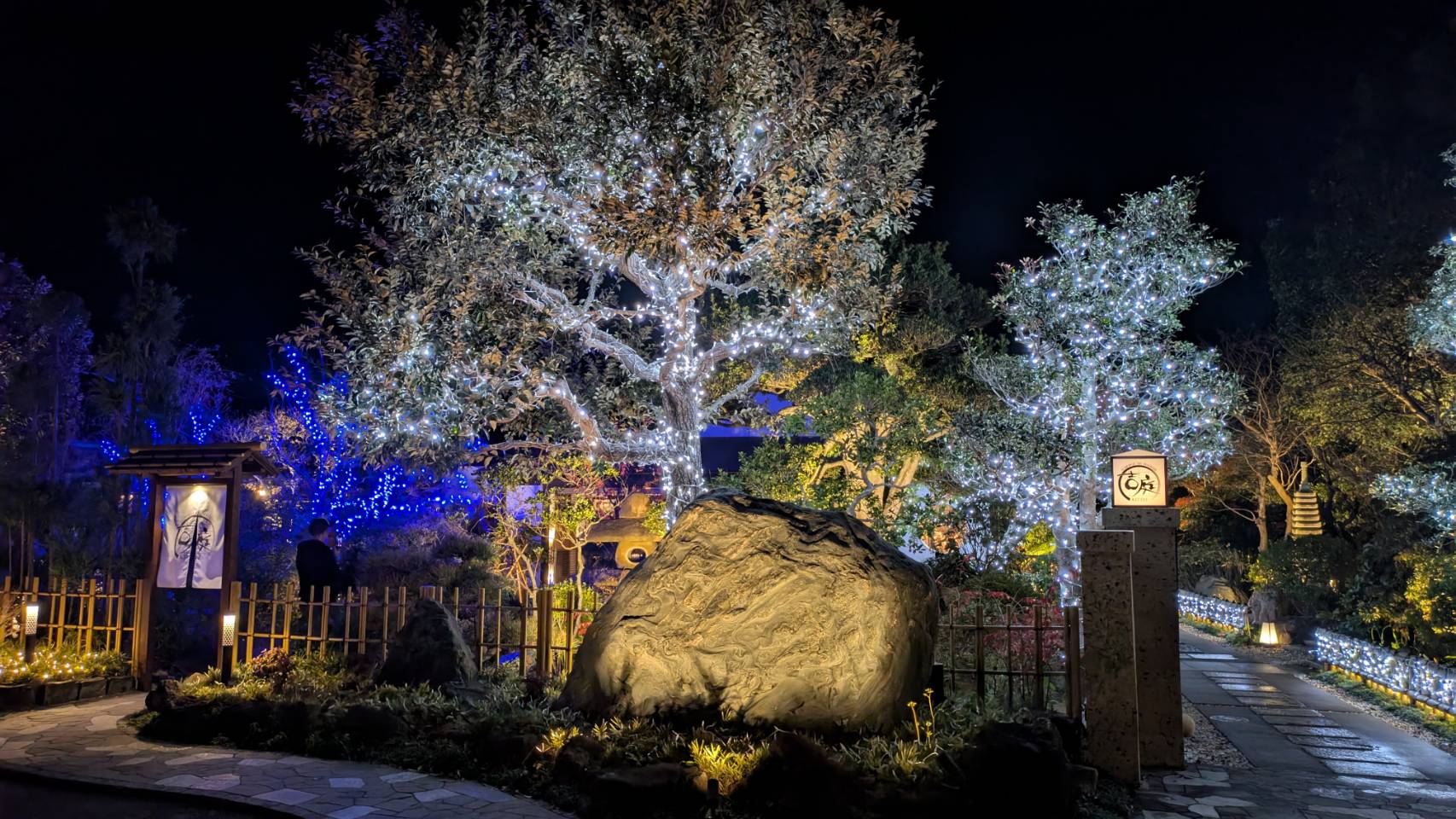 3本の樹にホワイトのストリングライトで装飾 暖色ではグランドカバー一面に
