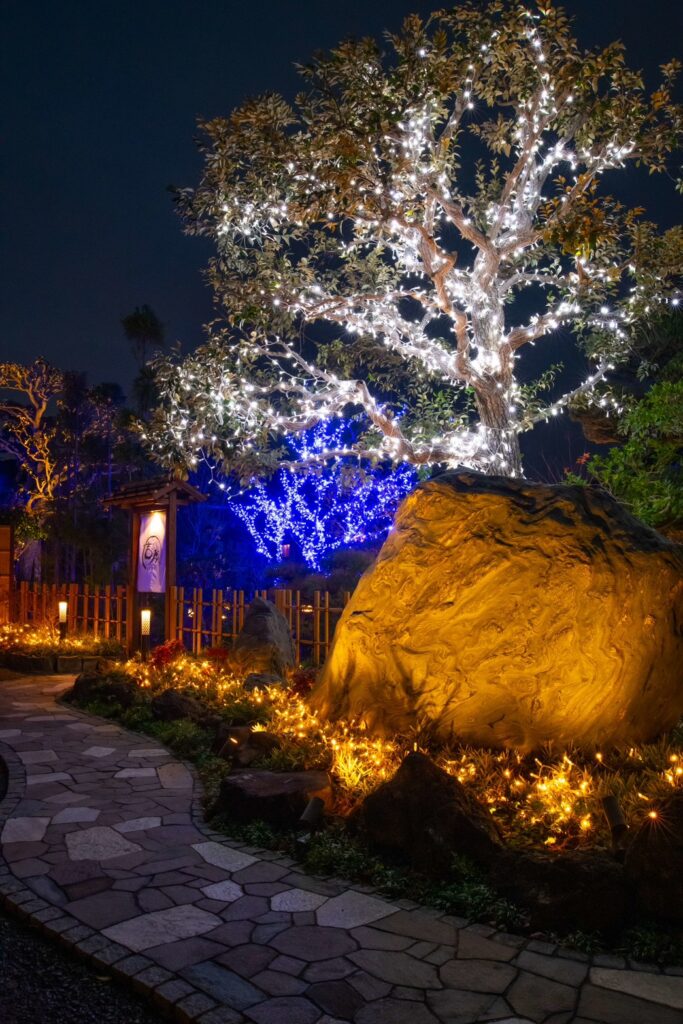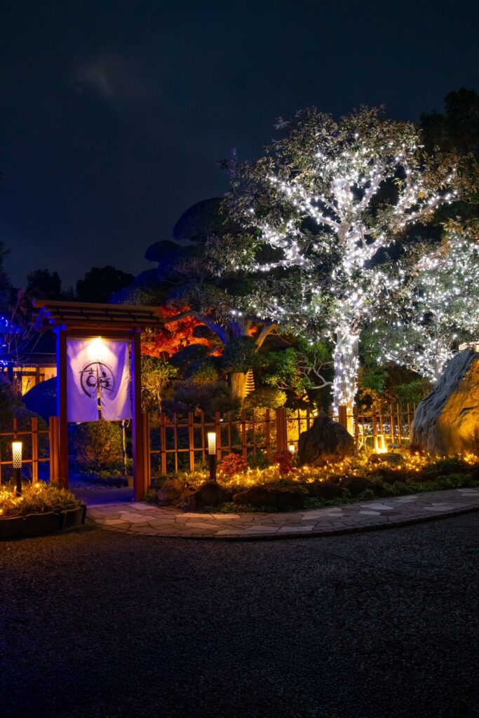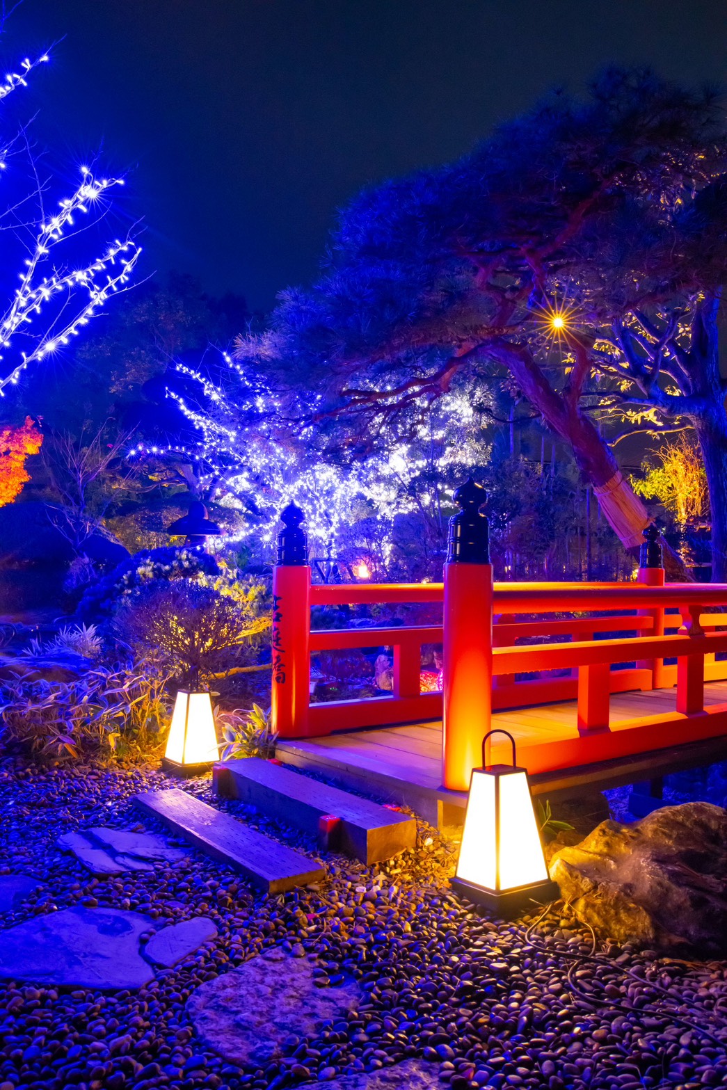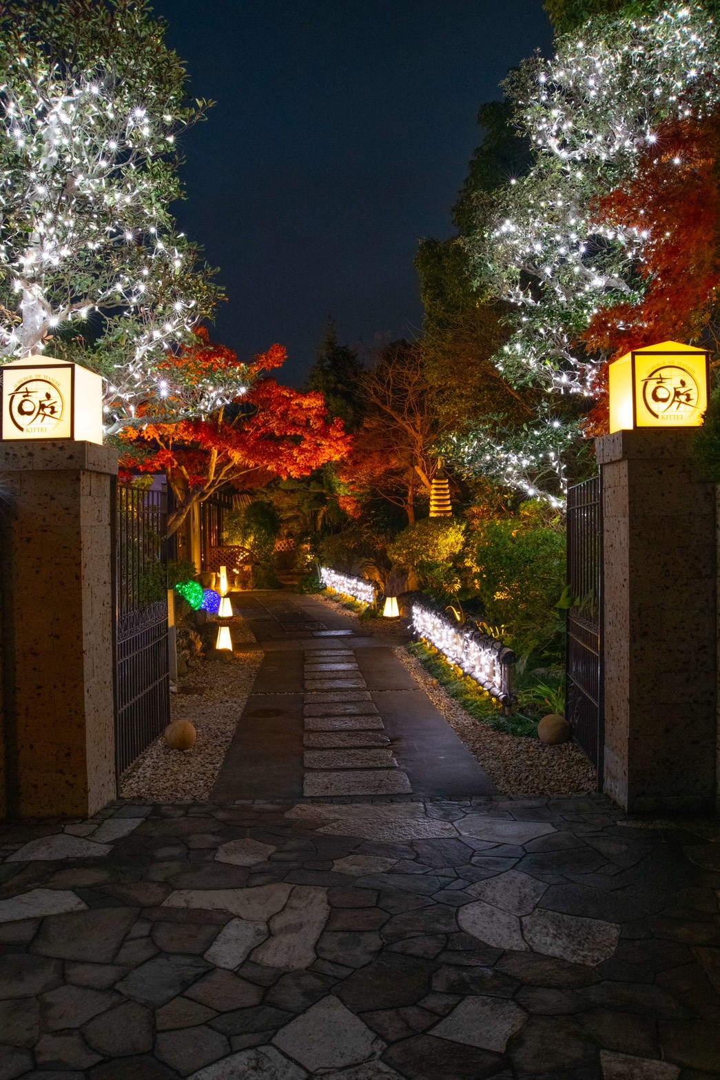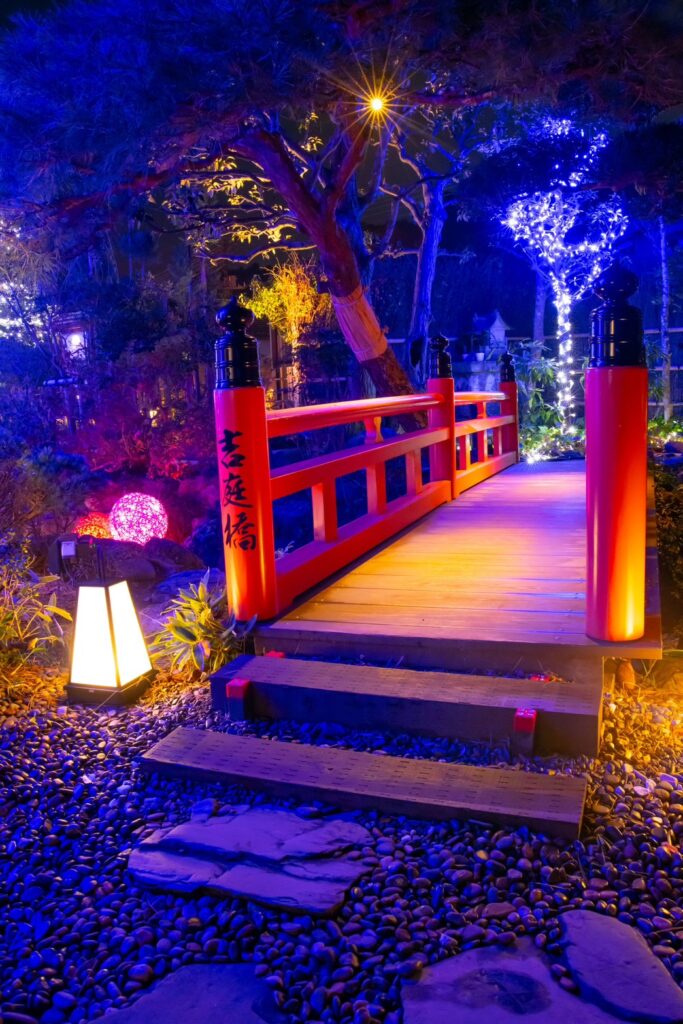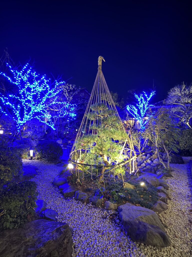 香取市佐原 オーベルジュ・ド・マノワール吉庭様 以前施工させて頂きました現場ですが、季節に合わせたリニューアル工事、以前はライトアップな照明で演出しておりましたが、季節に合わせイルミネーションで飾らせて頂きました、1万1千個のLEDで飾り御客様をお出迎えしてくれます、日本庭園ですが和とフレンチの融合的な御店ですので、奥庭はそのままのライトアップで和を楽しんで頂き、アプローチとなる御庭には青のLEDと白のLEDと白砂利で吉庭橋の赤の3色を合わせる事によりトリコロールカラーでフレンチを演出してありますので、写真を撮るときには是非このトリコロールカラーと御一緒に映って頂ければ幸いです