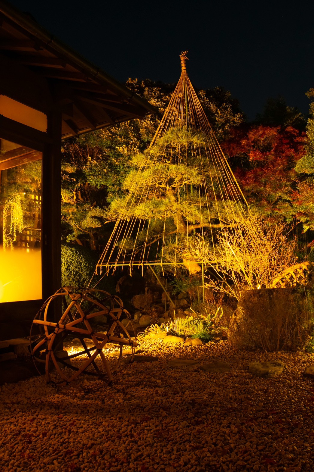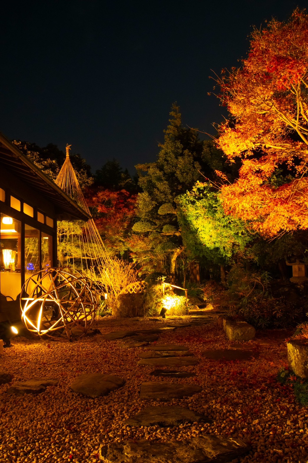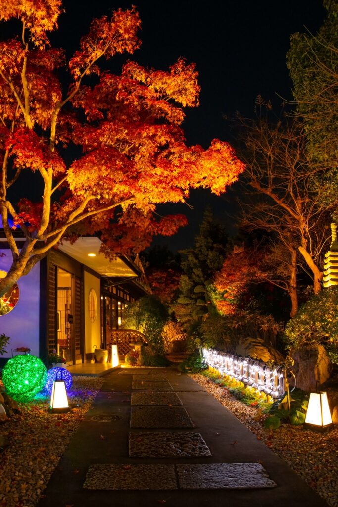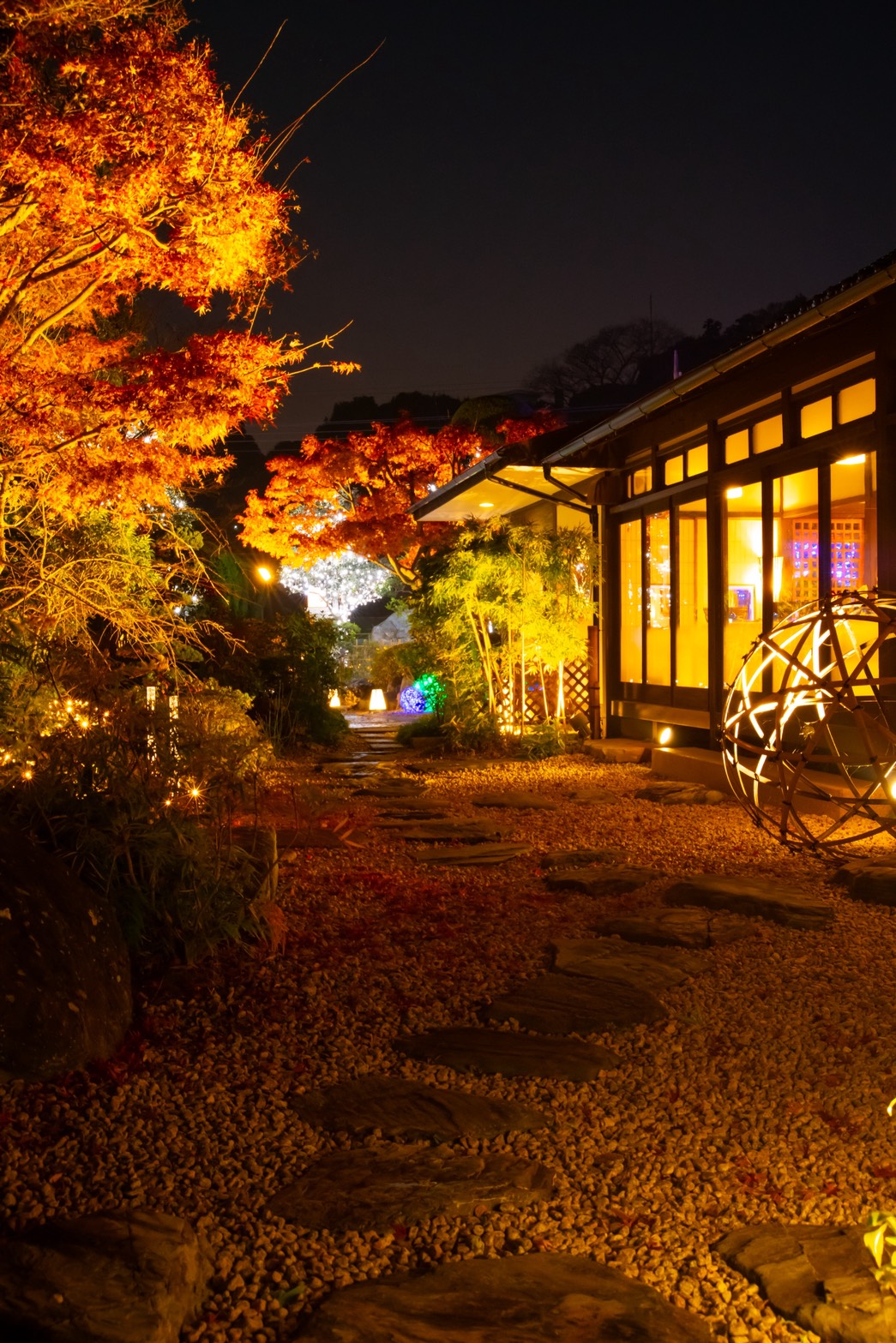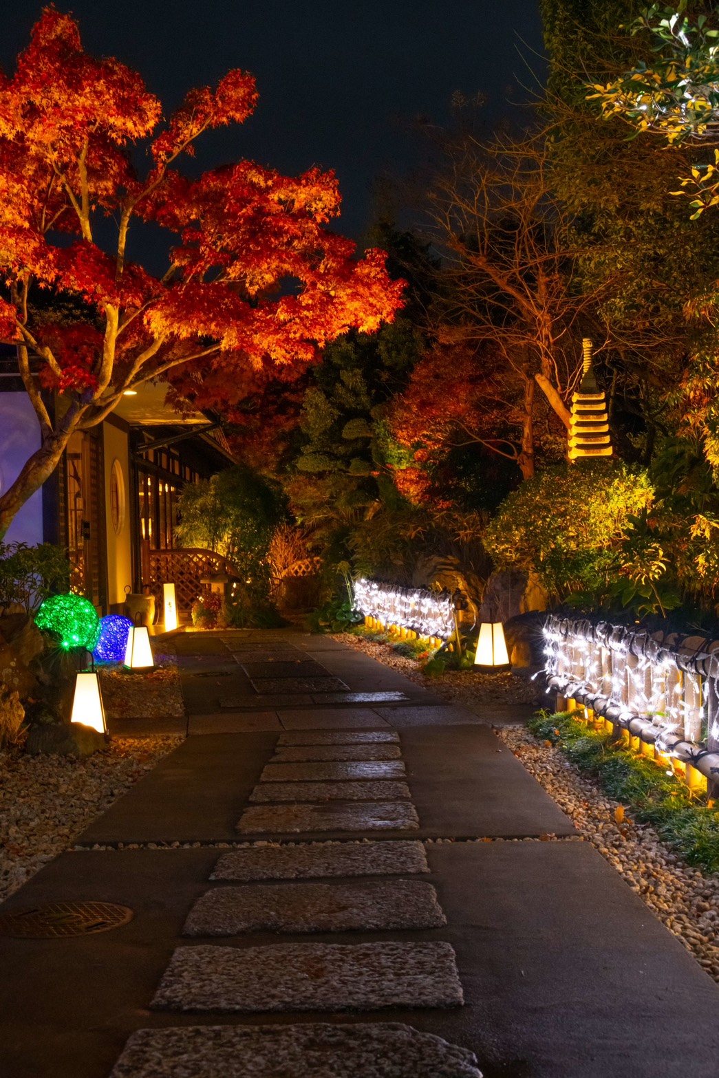 香取市佐原 オーベルジュ・ド・マノワール吉庭様 以前施工させて頂きました現場ですが、季節に合わせたリニューアル工事、以前はライトアップな照明で演出しておりましたが、季節に合わせイルミネーションで飾らせて頂きました、1万1千個のLEDで飾り御客様をお出迎えしてくれます、日本庭園ですが和とフレンチの融合的な御店ですので、奥庭はそのままのライトアップで和を楽しんで頂き、アプローチとなる御庭には青のLEDと白のLEDと白砂利で吉庭橋の赤の3色を合わせる事によりトリコロールカラーでフレンチを演出してありますので、写真を撮るときには是非このトリコロールカラーと御一緒に映って頂ければ幸いです
