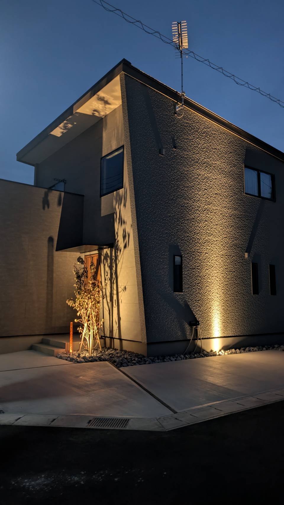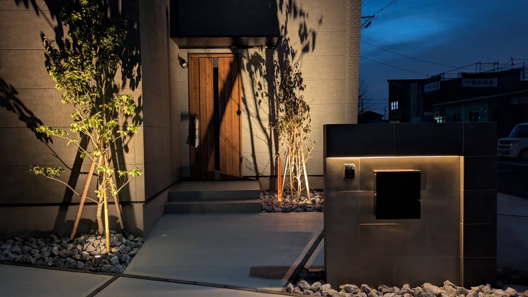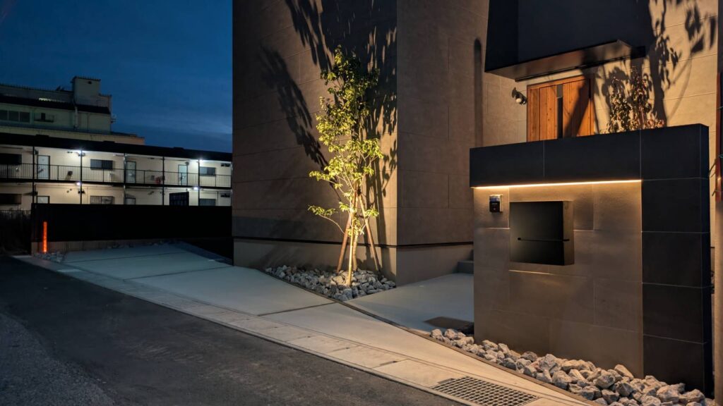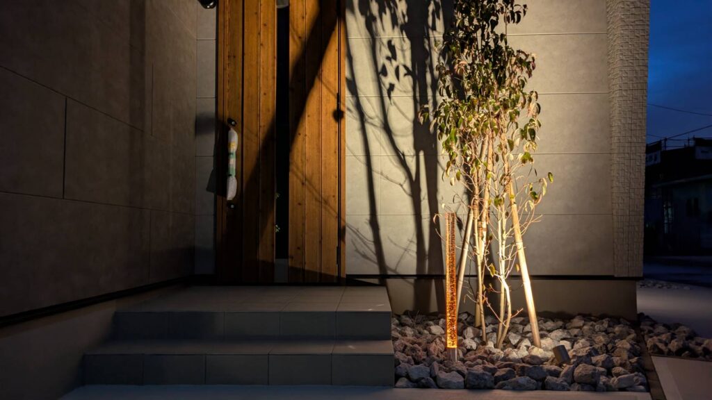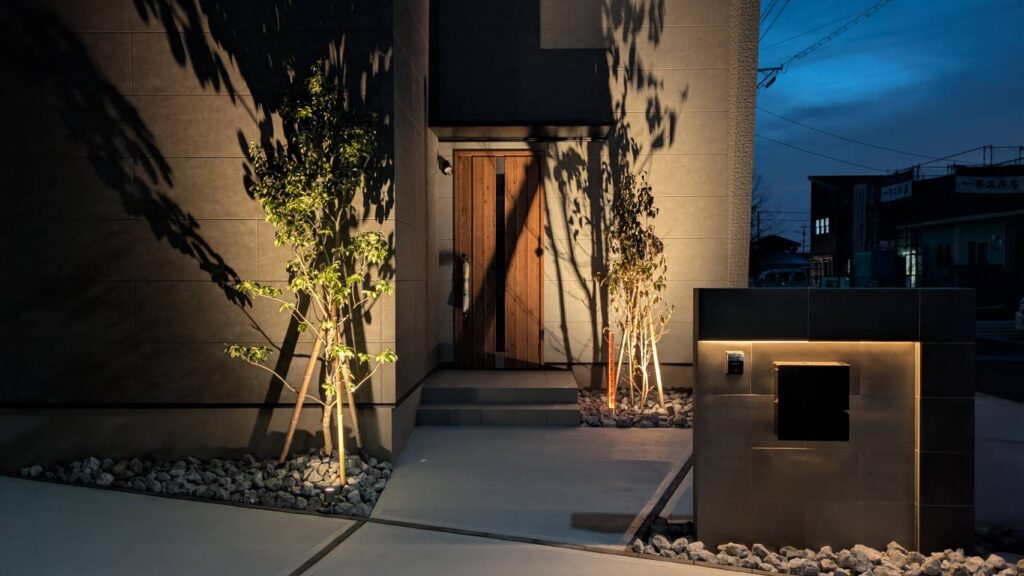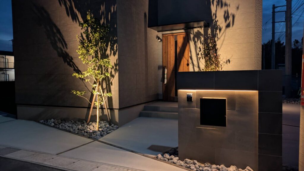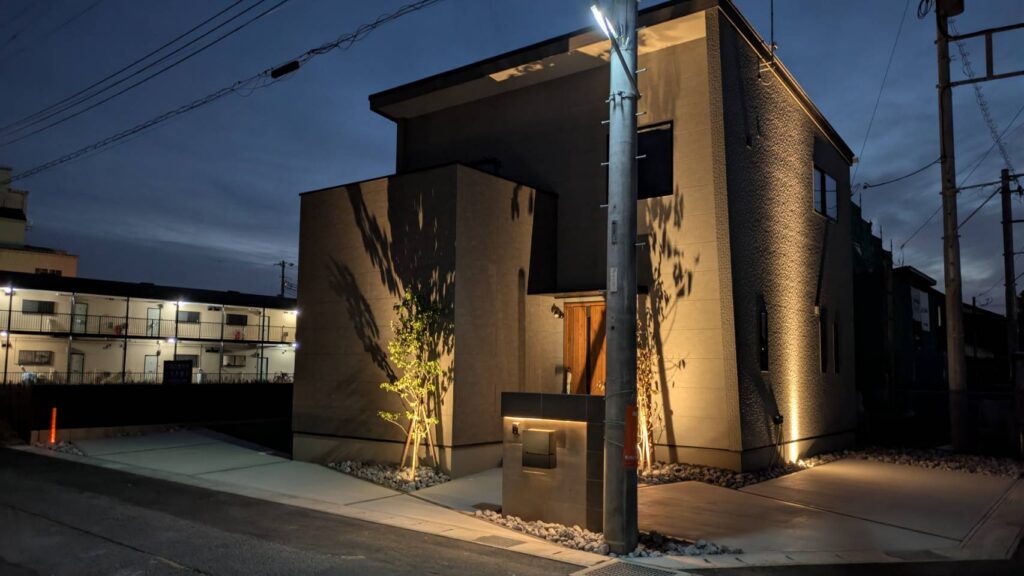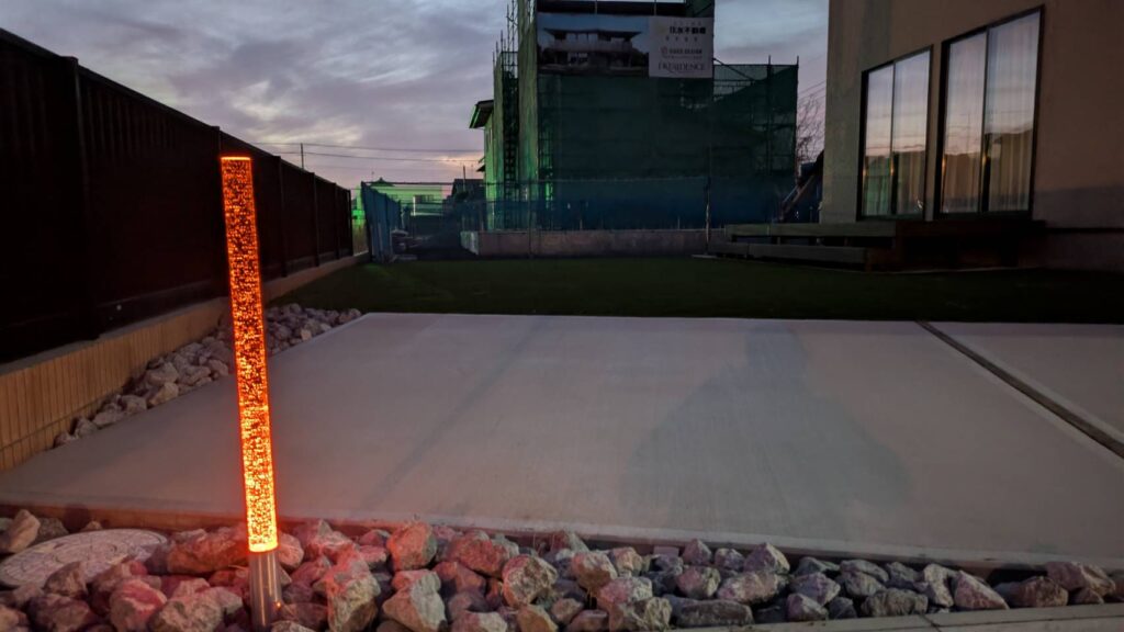 こちらの施工例も、クレアカーサ様の工事にて展示場となります、オープンのシンプルモダンスタイルなつくりとなっております、こちらもオリジナル商材を取入れて頂きクレアカーサ様ならではのオリジナルな外構となっております、駐車スペースは2台と広々としたお庭にはデッキと人工芝の組み合わせ、照明の一条の光はクレアカーサ様のオレンジカラーを取入れてみました、植栽や建物の壁にライトアップすれば、この様な仕上がりになります